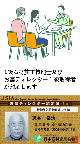 お客さまと一緒に墓地に行き、寸法測定や周囲に建っているお墓や環境について拝見させていただきます。ご希望を伺いながら、形や石種について大まかに説明します。地域や宗教によって、お墓参りの方法も違いますので、お客様のご要望を第一にお伺いします。
